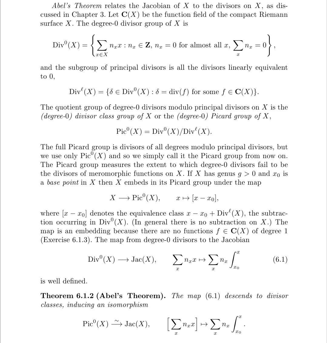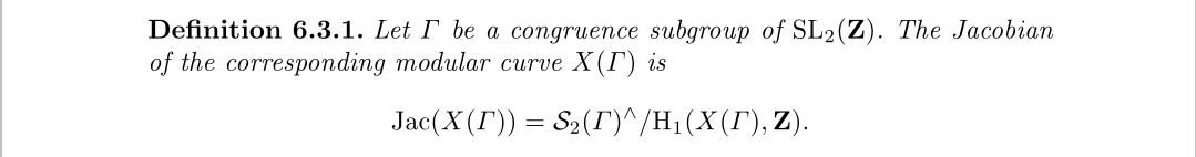 这是黎曼曲面上除子和积分方式的对应关系,从而引出了Picard群与雅可比簇对应关系,当然我们更感兴趣的是怎么把雅可比簇计算出来,在《Algorithms For Modular Elliptic Curves》这本书里有详细地介绍,对于亏格为g的模曲线,我们自需要计算出同调群上的参数即可,总共有2g个g维复向量