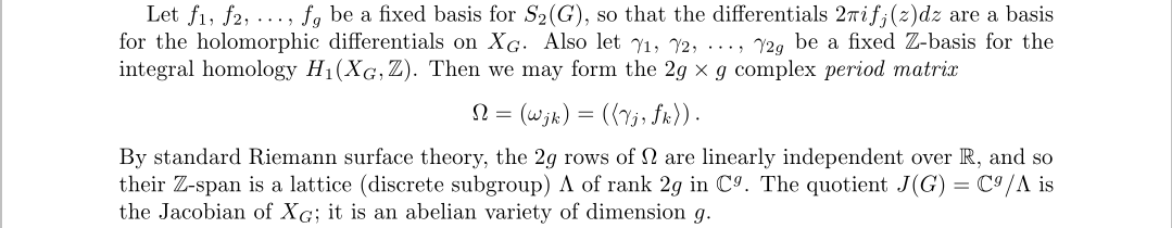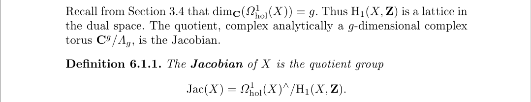 在这里我们构造了模曲线的雅可比簇,但我们需要注意的是所有的紧黎曼曲面都可以构造雅可比簇