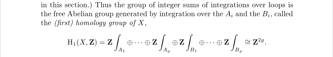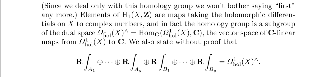 积分运算正是其中的一种情况,我们通过路径的不同来区分不同的微分形式到复数的映射。正在认识同调群和雅可比簇时,积分什么的只是计算方式而已,本质还是得把同调群视为整格,对偶空间视为高维复平面,雅可比簇视为高维复环面。这里提到积分的主要作用是计算和证明,比如下面的对应定理