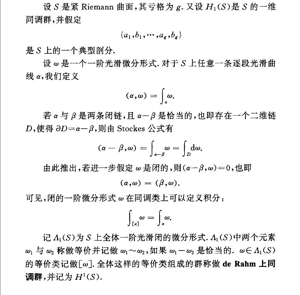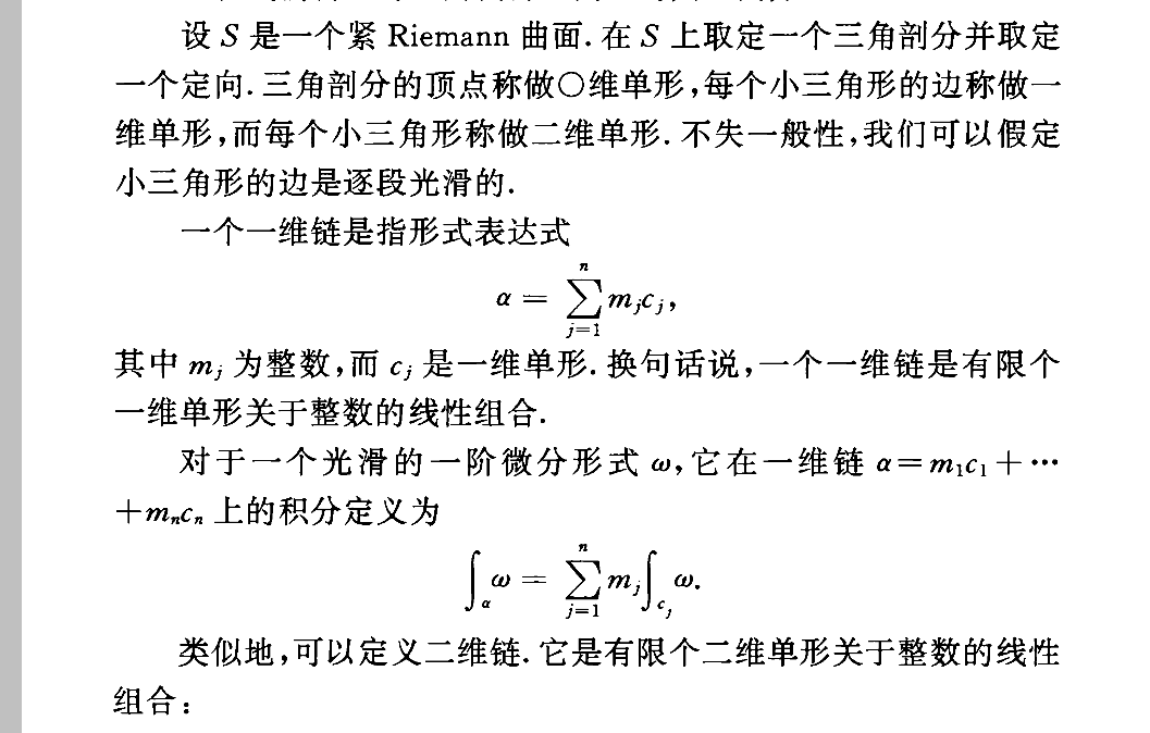 废话很多,我把关键部分说一下,首先在黎曼曲面上积分,需要两个东西,路径和微分形式,路径不单指黎曼曲面上的一条路径,还包括路径的线性组合,因为积分有线性的特点,所以定义路径的线性组合上的积分是合理的,如果要求线性组合的系数为整数,那么称其为一维链,详细内容如下