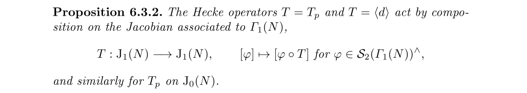 雅可比簇可以看成一个积分路径的等价类,或者是由微分形式到复数的映射等价类,Hecke算子作用于雅可比簇实际就是,先作用于微分形式再进行积分映射,而它之所以是一个定理,因为我们需要证明这样交换运算后等价类的像依旧是一个等价类才行。