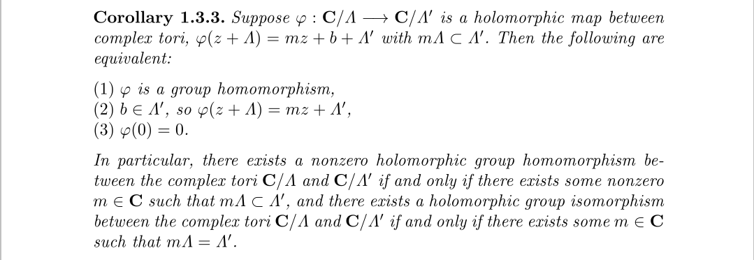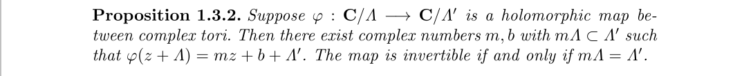 这个定理包含了全纯映射的情况,而我们探讨的实际上是最后一部分即可逆的情况。换言之一个格可以通过乘以一个复数得到另一个格,那么它们生成的复环面就是解析同构的,用几何的观点来看就是,格进行了旋转和缩放两种变换,为什么没有平移?这需要考虑环面上的群结构了,对环面上的两个点,我们定义加法就是对应等价类中代表元的加法,可以证明C/∧关于此运算可以形成一个加法群,于是两个环面之间的全纯同态可以诱导一个群同态,并且有如下性质