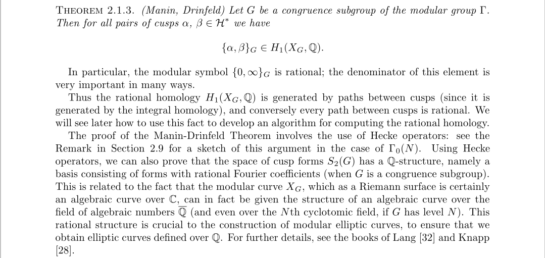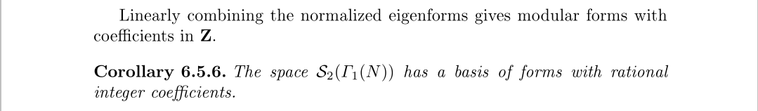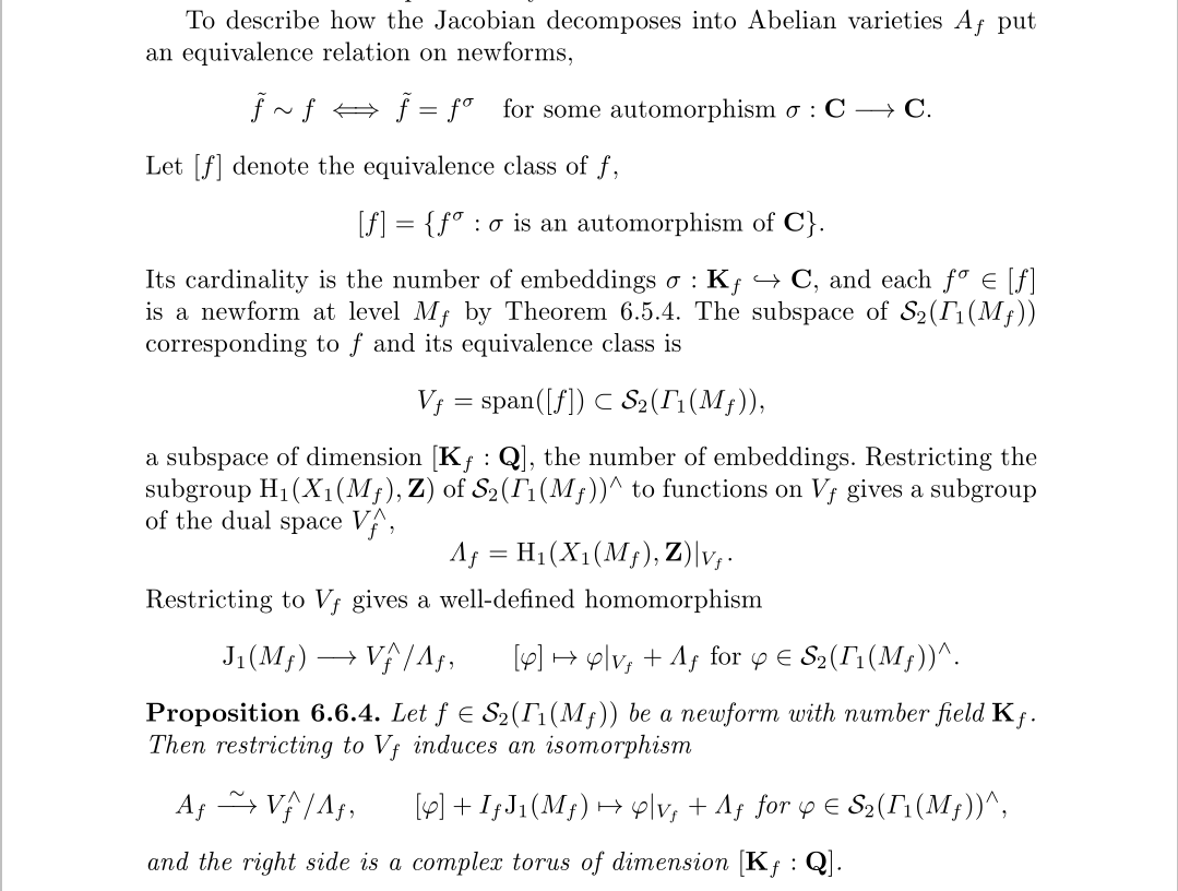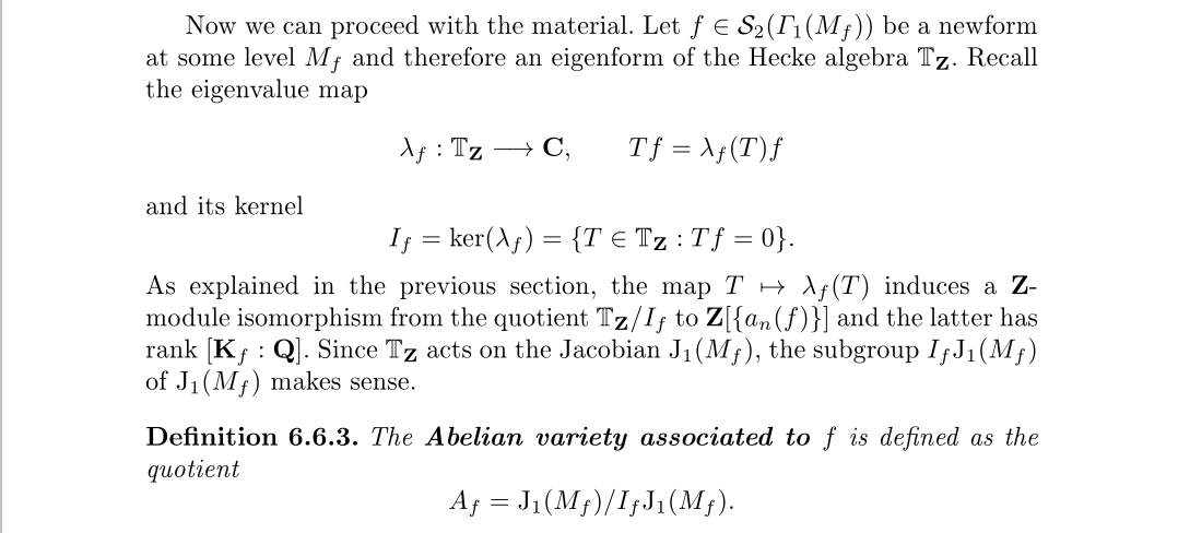 而之前所说的有理数系数,指的是尖形式空间的可能基,新形式是基,但基不一定是新形式,所谓雅可比簇的有理构造并不是指其中的复参数都是有理数,指的是有理数的代数闭包,即代数数,这个事实十分重要,正因为这个事实,后面我们才能对阿贝尔簇来构造Galois表示。至于阿贝尔簇怎么计算,由于上面的定理,其实跟雅可比簇的区别不大