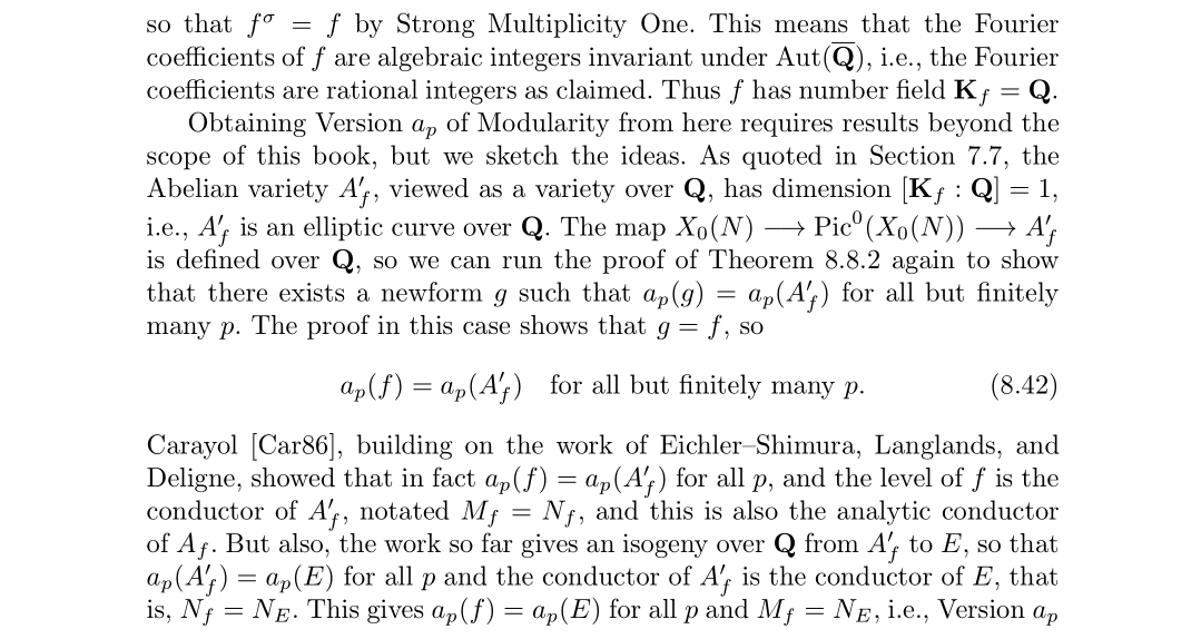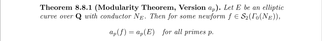 在本章中,我们只做了一件事就是,从模形式的世界走向椭圆曲线的世界,通过这样的探索我们发现,Q上的椭圆曲线似乎有些特别,好像可以由模曲线通过一系列映射构造出来。而且通过Eichler–Shimura, Langlands, and
