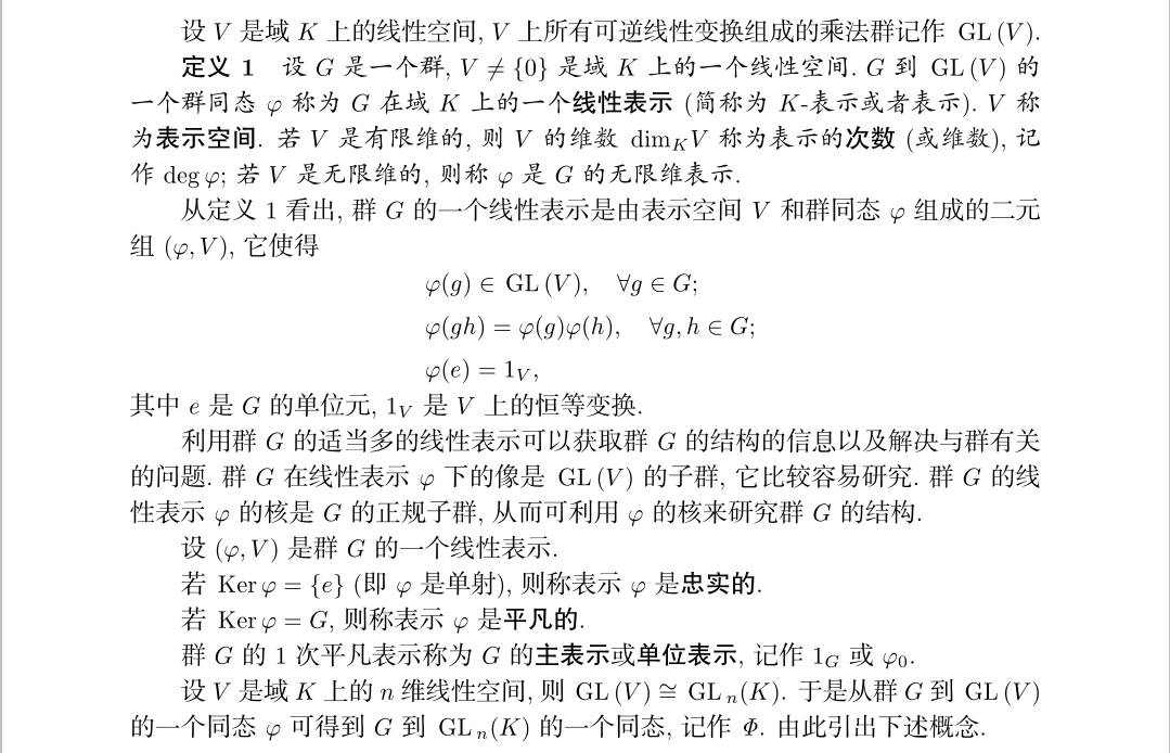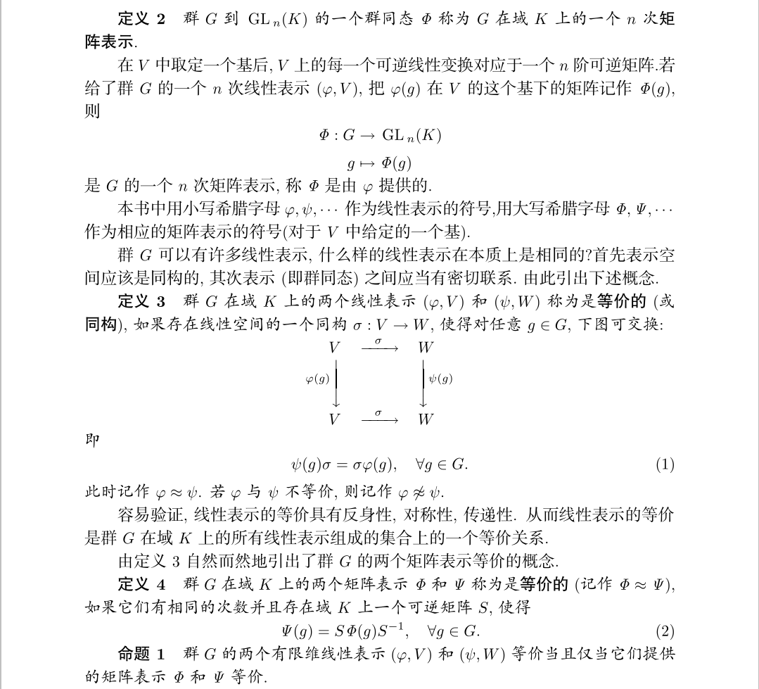 因此以后研究表示,我们所指的都是矩阵表示,原始的定义主要有助于证明一些表示的基本定理,但从一般层面上来看的话,矩阵表示有助于我们理解表示,并运用表示的理论。至此我们知道了一个表示有几个决定因素,需要被表示的群G、基域K、维数n、群同态方式ρ。