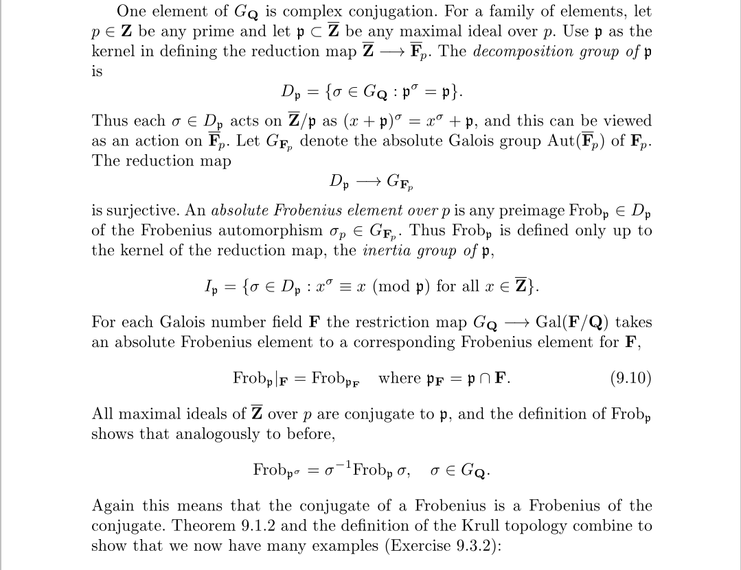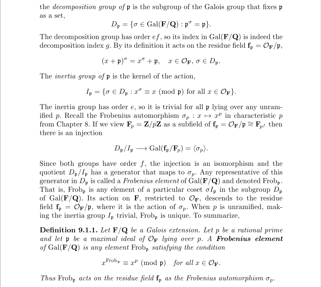 Frobenius元素关于某个极大理想定义,也可以视为基于某个素数定义,我们研究其的目的主要为了从代数数中挖掘出p进数来,挖掘的第一步就是先从理想导出特征为p的有限域,但这样是不够的
