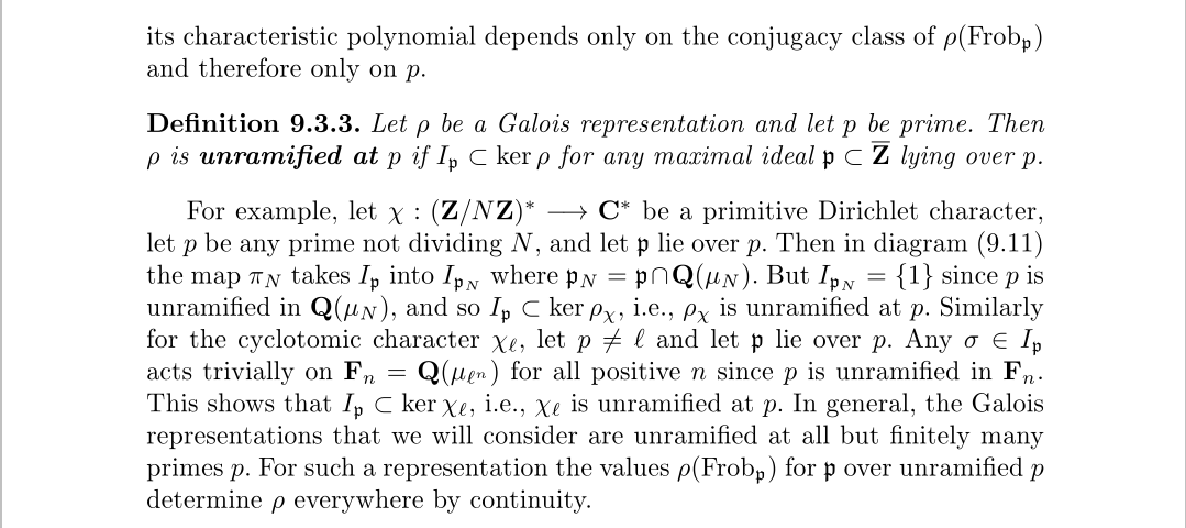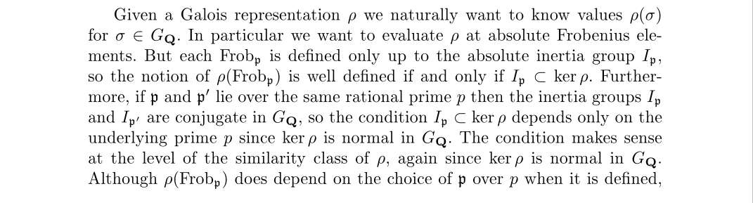我们需要保证,表示对于同一理想下的Frobenius元素结果是一样的,所以我们定义了一个表示,在一点素数上的非分歧,或者在一个极大理想上的非分歧
