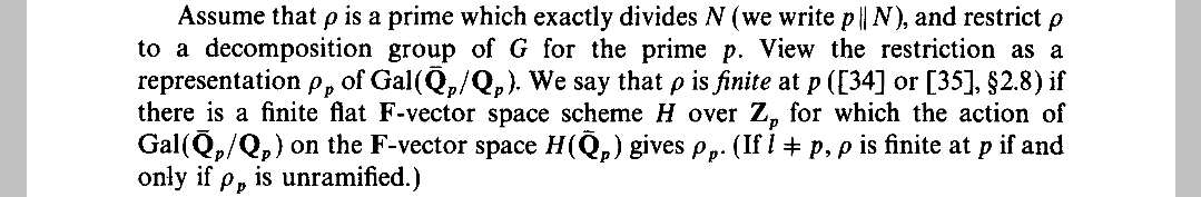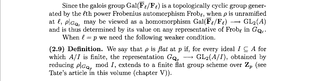 这里面的定义链有些复杂,我们来理清一下,首先最开始的定义是“表示在某点有限”,它涉及代数几何的相关概念,这样的定义显然有些不够纯粹,而“非分歧”就很好地将有限的大部分“有限”的情况给带走了,而且还不涉及代数几何的概念,而另一部分我们就干脆定义为了“平坦”,所以分歧实际包含了两种情况,一个是有限中的平坦情况,另一个则是不平坦的情况。所以表示在一点的情况,分为不有限、非分歧和有限平坦三种。知道这些东西对我们理解Ribet定理是十分重要的