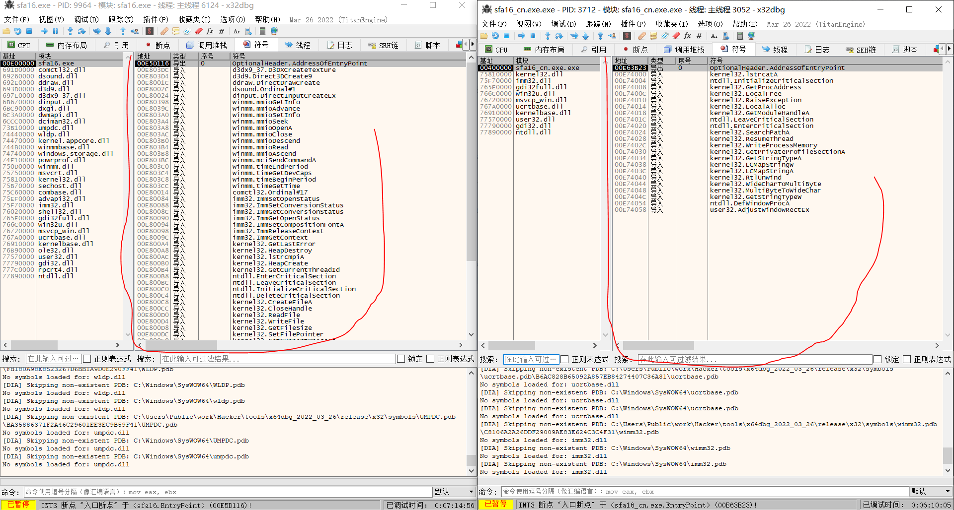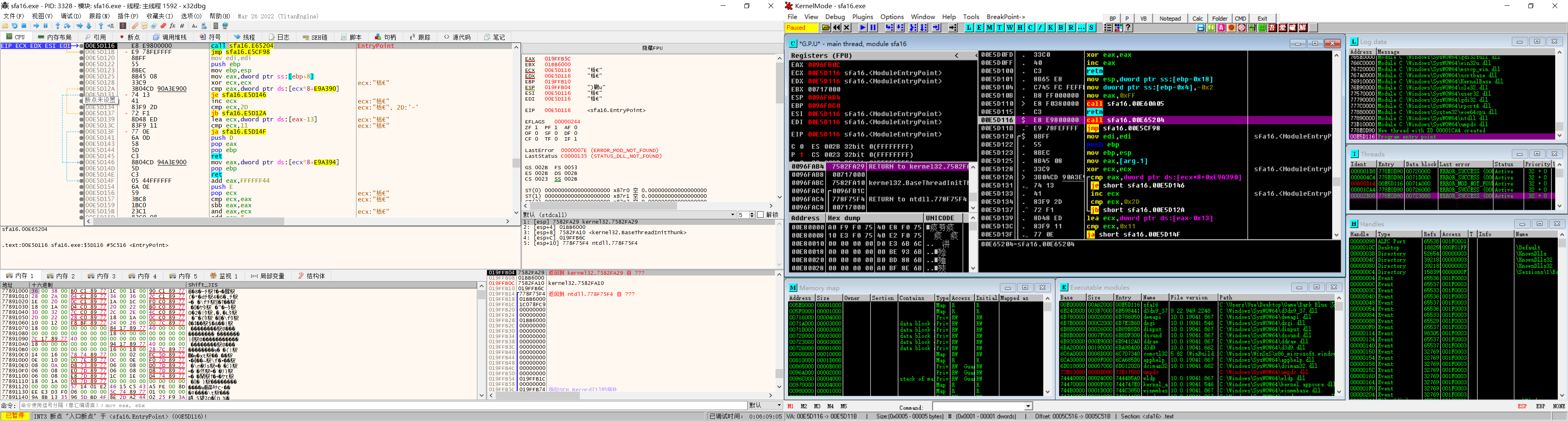 我们发现游戏资源是以日语形式存在的,也就是说这些数据是给原始程序使用的,那么我们的汉化跑哪里去了呢?这时我们注意到sfa16_cn的内存比原程序大了几倍,这意味着汉化脚本应该在程序里面,没办法了,只能先动态调试一下了,首先我们将程序运行起来