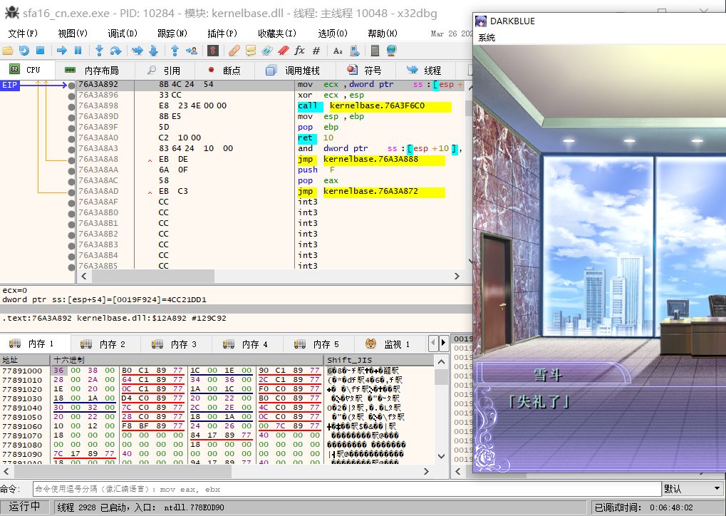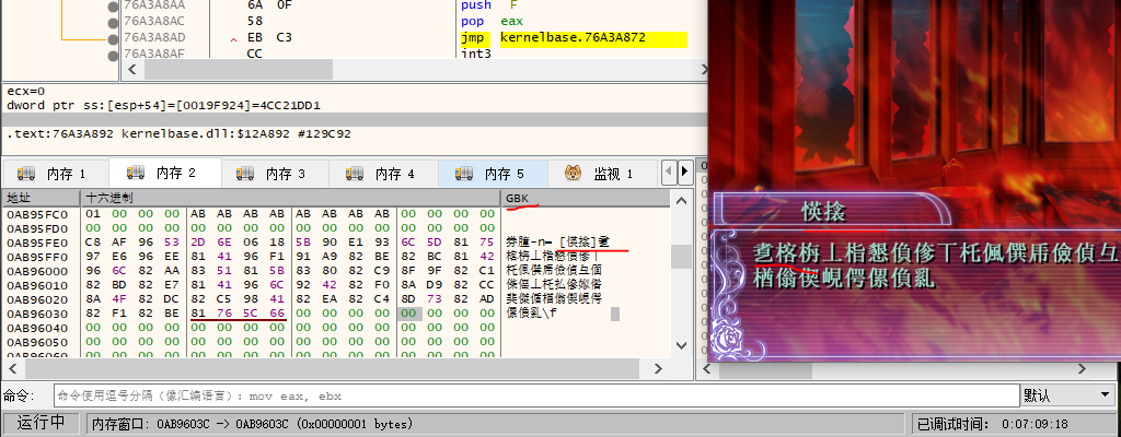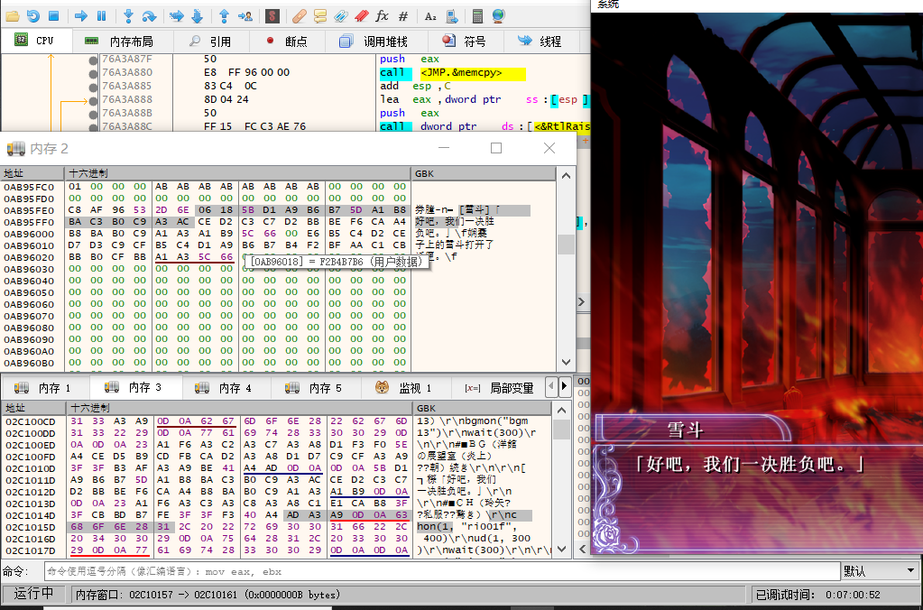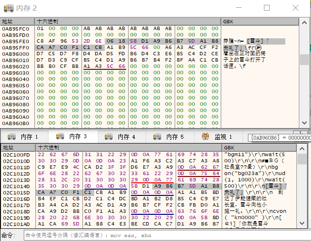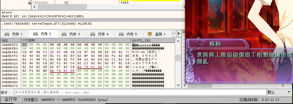 上面是这句话所在的内存地址,大概在0xAB95FE0处,而下面的则是脚本读取后所在的缓存地址,大概在0x2C1014D处,值得注意地是这些都是程序运行的虚拟地址,在主程序的十六进制文件中是找不到的。我们随便跳点剧情,可以看到