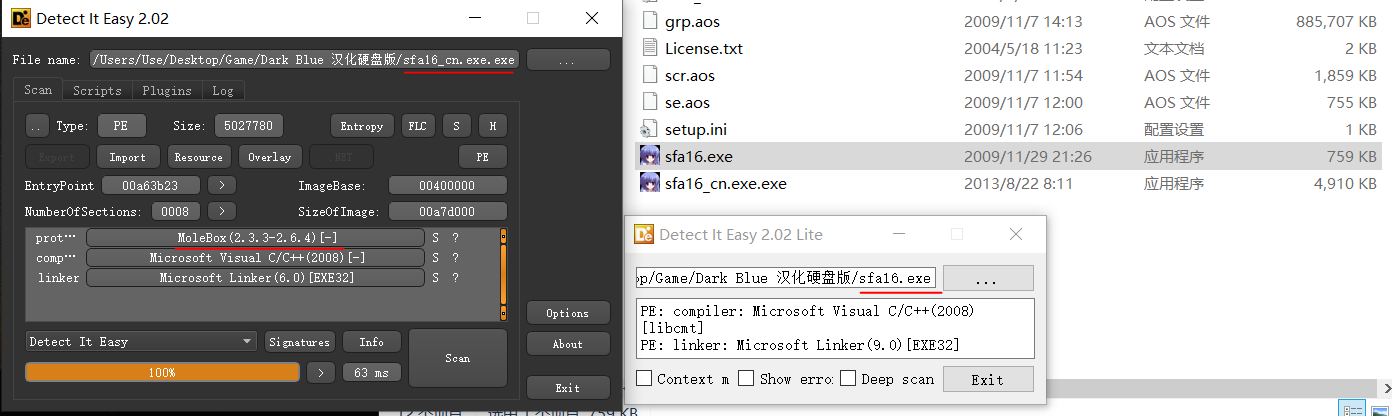 原始程序没有任何加密,而汉化补丁使用了MoleBox,这是window的一个资源打包工具,随便使用一个程序就轻松地把它解开了
