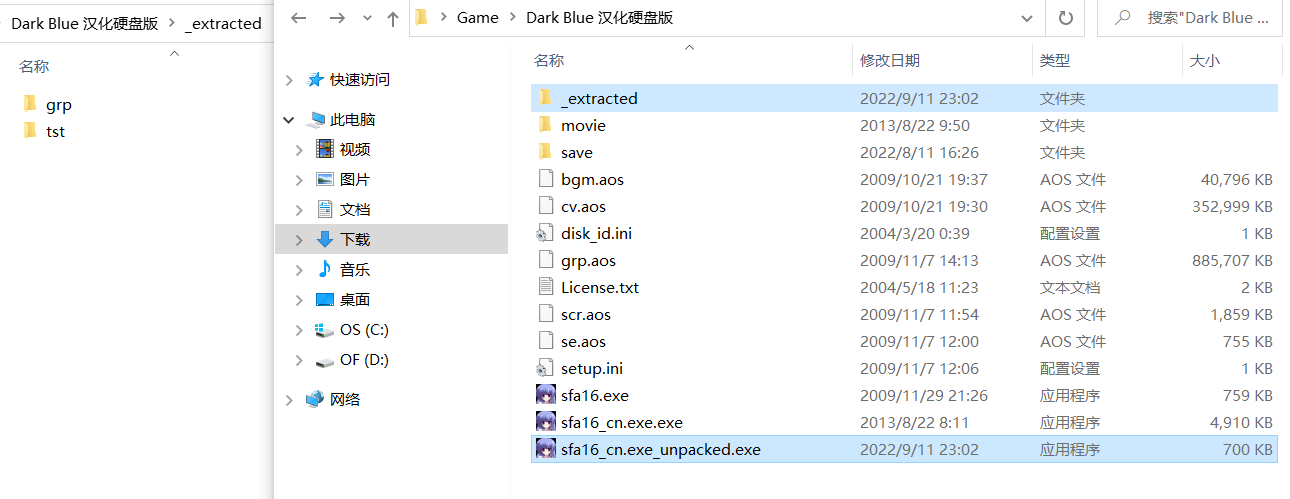 汉化exe和原版exe内存虽然接近,但仍有较大差别,所以肯定被改过来,我们看看到底被改了什么,在此之前我们先将_extracted里的文件移出来,让汉化补丁读取到它,你可能会有疑问,为什么同样是目录下的资源文件,却优先读取汉化补丁呢?这其实游戏通常的开发习惯有关,进行调试的时候,我们一般都希望是明文,这样便于修改,脚本游戏也是类似的,但存在封包资源和解包资源,优先读取解包资源,利用这一点很多游戏有衍生出来patch即补丁机制