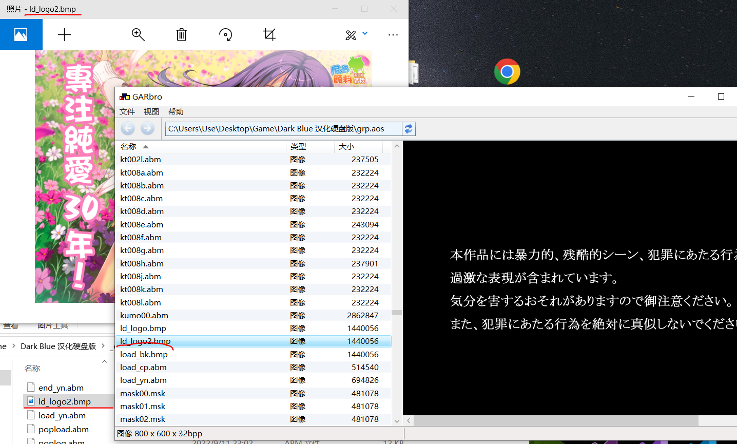 最后进行同样的操作,校验一遍后没有遇到什么大问题,于是得到了第一个混合包,中日混合版,接着我们直接对其它部分用百度翻译,突然发现机翻也没那么好用,它会直接改变脚本的结构,还得一句句复制机翻,呵呵,算了吧,反正我也不怎么喜欢这个游戏,同一题材的3days和euphoria的剧情明显优秀多了,就让有志者去翻译吧,而且日语我又不是看不懂,下面是解包资源,将里面没汉化的脚本进行汉化,再用随便一个打包软件,比如EnigmaVirtualBox,就能制成汉化补丁了。