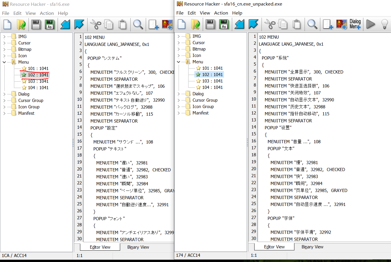 解包后的exe与原程序的大小基本一致,这里我们稍微提一下window的资源查找机制,当代码中查找当前目录中的文件时,会优先看exe是否是打包型资源,并在里面进行查找,没有的话才会查找当前实际的目录。正因如此,我们就会见到两种类型的程序,一个很大的exe,又或者是exe带了一堆dll和资源文件,当然了单文件的时候也有可能是它本身没有依赖。这种资源打包机制的一个作用就是PC程序安装,安装包就是资源打包型的exe,一部分是配置代码,另一部分则是作为资源的主程序,运行过程就是将exe内的资源复制到安装路径,并进行一些必要的配置操作,像修改注册表之类的事。而我们则是利用它来实现汉化补丁与日语原版的共存,运行原版时它读取路径下的原版资源,而运行补丁的时候,但遇到汉化文本时优先读取exe内的汉化资源,而对于exe内没有的cg之类的,则进一步读取当前的目录,从而达到对于非汉化资源读取共同部分,而汉化资源读取各自部分的目的。当然了,直接改日语的资源也是可以达到汉化的目的的,但总会给强迫症一种不是很完美的感觉。