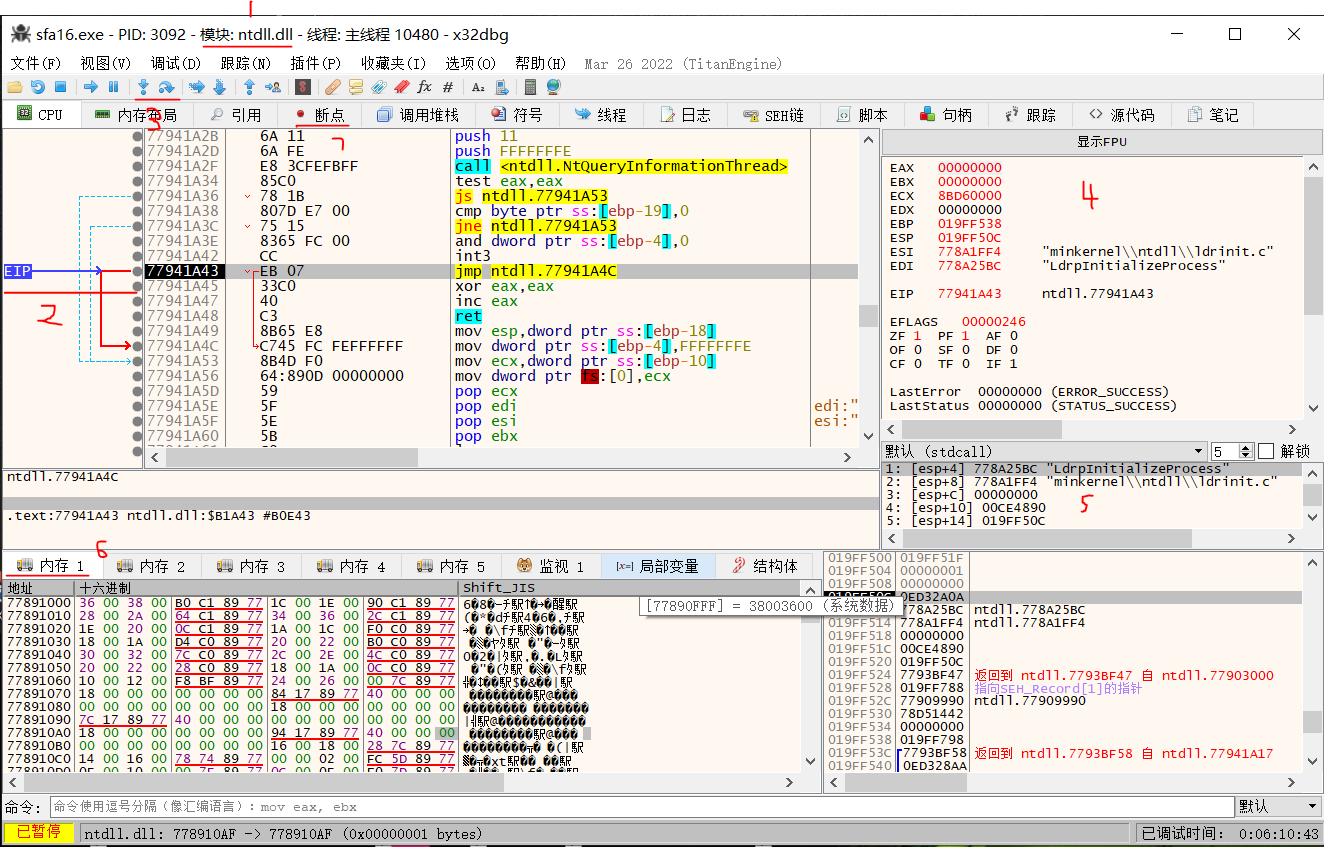 首先是区域1的“模块1:ntdll.dll”,它表示当前代码所在的文件部分是动态库内而不在主程序里,对于非主程序部分一般都是不考虑的,它属于系统代码,可以相应的系统API手册来看用法,没必要去读难理解的反汇编代码;接着是区域2的eip寄存器,它指向将要执行的代码,也就是当前调试到了代码哪里的意思;区域3有步进和步入两个操作,它们用来推进代码的执行步入是一行行执行,而步进则会对函数调用的代码跳转进去,如果对于某些函数的作用不清楚的话,则可以跳进去看看,对应到汇编代码就是“call+地址”;区域4则是显示CPU的寄存器参数,比如EAX、EBX之类的寄存器,还包括记录下一步代码地址的EIP指针和一些标志位ZF、PF等;区域5是stdcall即调用栈堆,表示call指令调用路径,此处可以约化深度,更详细的需要选项栏中的调用栈堆;区域6则进行内存的监控,但地址需要自己从运行内存中找,一般动态修改工具都是在这部分区域找到对应参数进行修改的,比如你在代码里申明int i = 1之类的就可以在里面找到;区域7是用来管理断点的,断点这玩意一般的调试都挺常见了,运行的时候我们一般不会从头一行行的到想调试的地方,而是通过在特定位置打断点,等程序运行到此处再调试。这样,其实我们对x64dbg当然基本界面就已经很熟了,当然如果你对程序的运行机制很了解的话,自然就知道它需要什么,它该是什么样,然顺便就在程序中找到了它的对应位置。