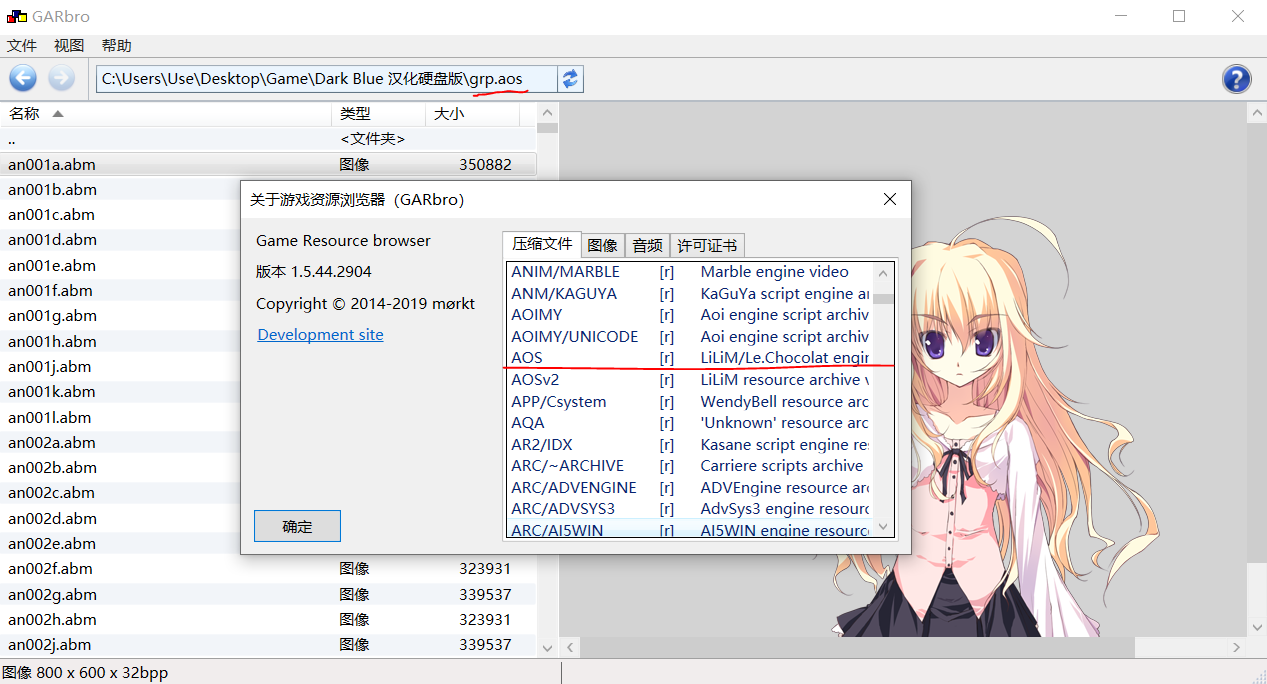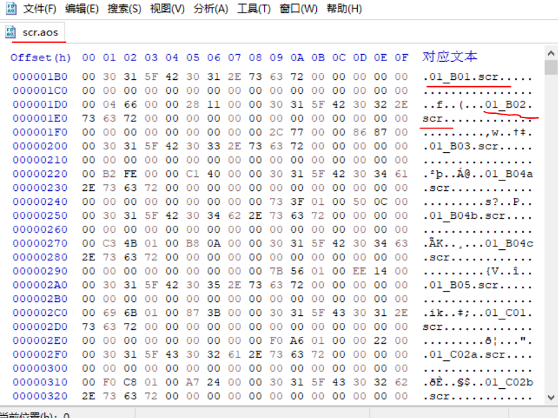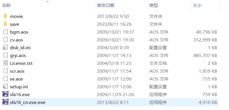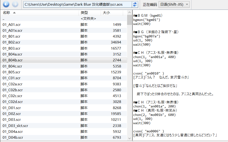 其中ini是明文配置文件,txt是开源使用协议,movie是游戏的OP,save是游戏存档,sfa16.exe是原始的程序,sfa16_cn.exe.exe是汉化后的程序,aos是可以被GARbro解包的资源文件,其中的scr就是我们汉化的核心,剧本文件了,通过简单的解包
