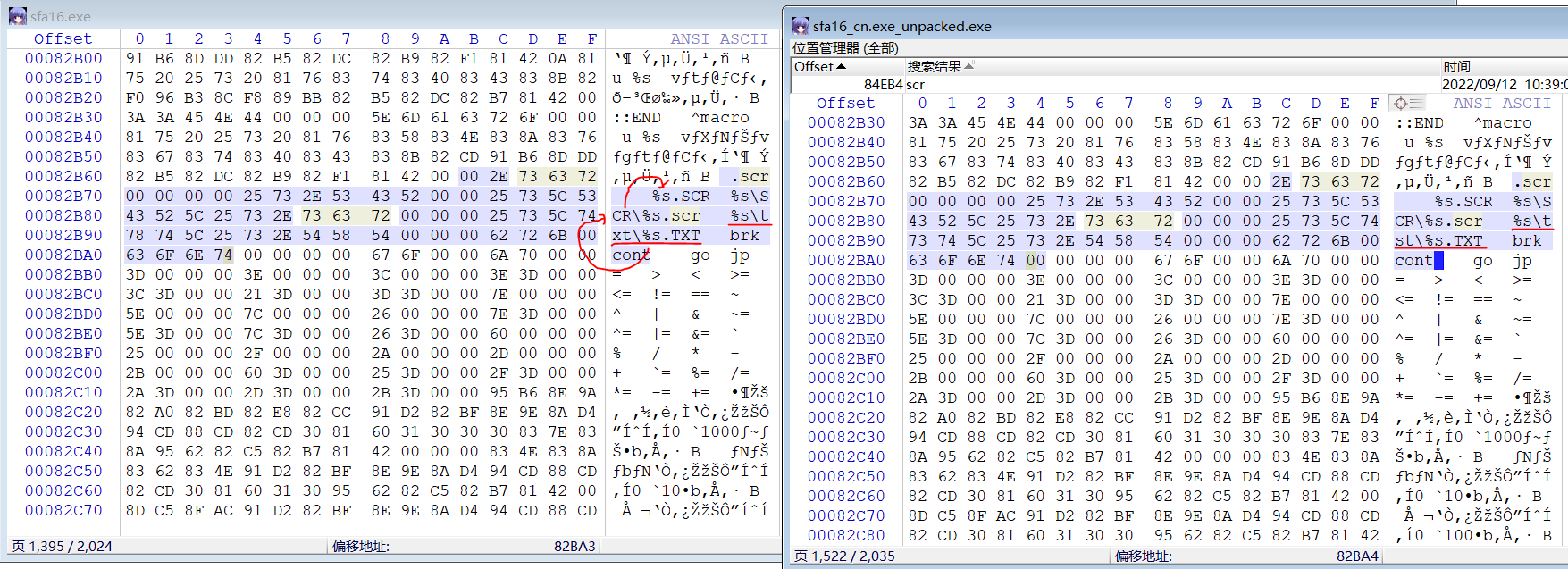 如果对应到非封包资源理应是scr/+.scr,但它却是tst/+.txt文件,注意到两者长度一致,所以大概率是改了16进制文件进行重定向,通过16对比,我们可以发现修改的地方