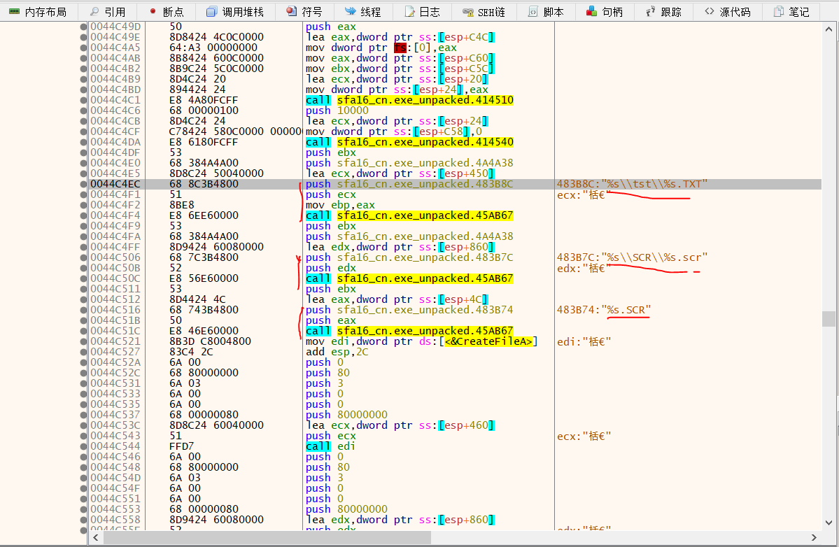 首先我们可以猜出,游戏对脚本资源的读取顺序应该是,txt/%s.txt、scr/%s.scr和%s.scr,其中的%s应该是占位符用来表示要读取的脚本的名字,而原始的读取方式应该是第二种,破解则是针对第一种,大概是用来测试的情况,将原来的txt/%s.txt改成了汉化所对应的tst/%s.txt,为什么可以这么猜?只能说这是实际测试出来的结果,只要敢于尝试就能猜出来,实在不行的话,就定位去读汇编代码吧