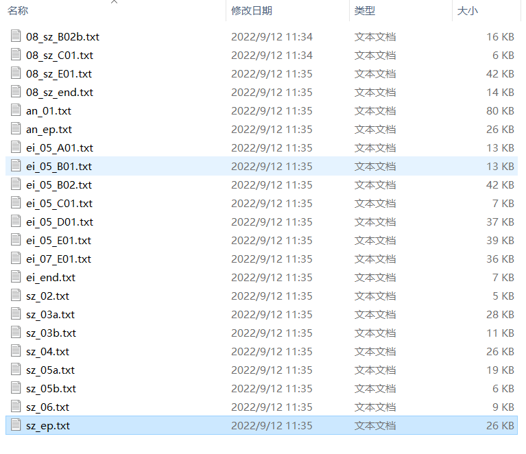 我们预计完成两个改造,首先提取所有的包含剧情的脚本,然后移动到tst内,对于出现的跳过即可,然后时间排序,对于刚引入的资源进行编码转化,这样进行一次封包,从而得到中日混合的游戏,至少不包含乱码了。接着我们对日语部分进行机翻,我不是很喜欢这个游戏,所以也懒得去润色或自己翻译了,这样完成了第二次封包,拿到一个中文的补丁,这样我们的目的和任务就全部都达成了。首先,我们查出,包含剧情且没被汉化的有下面这些
