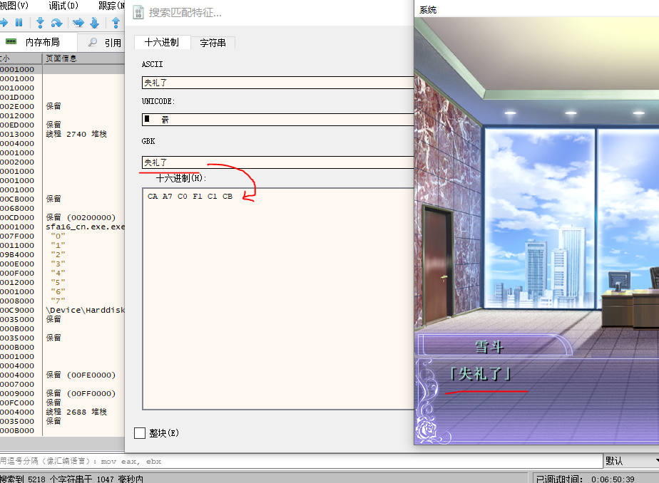 我们想要干嘛呢?在运行内存中找到这句对话,并顺手找到脚本所在的地址,从而看看改后的剧本长什么样,我们对内存进行特征匹配收索