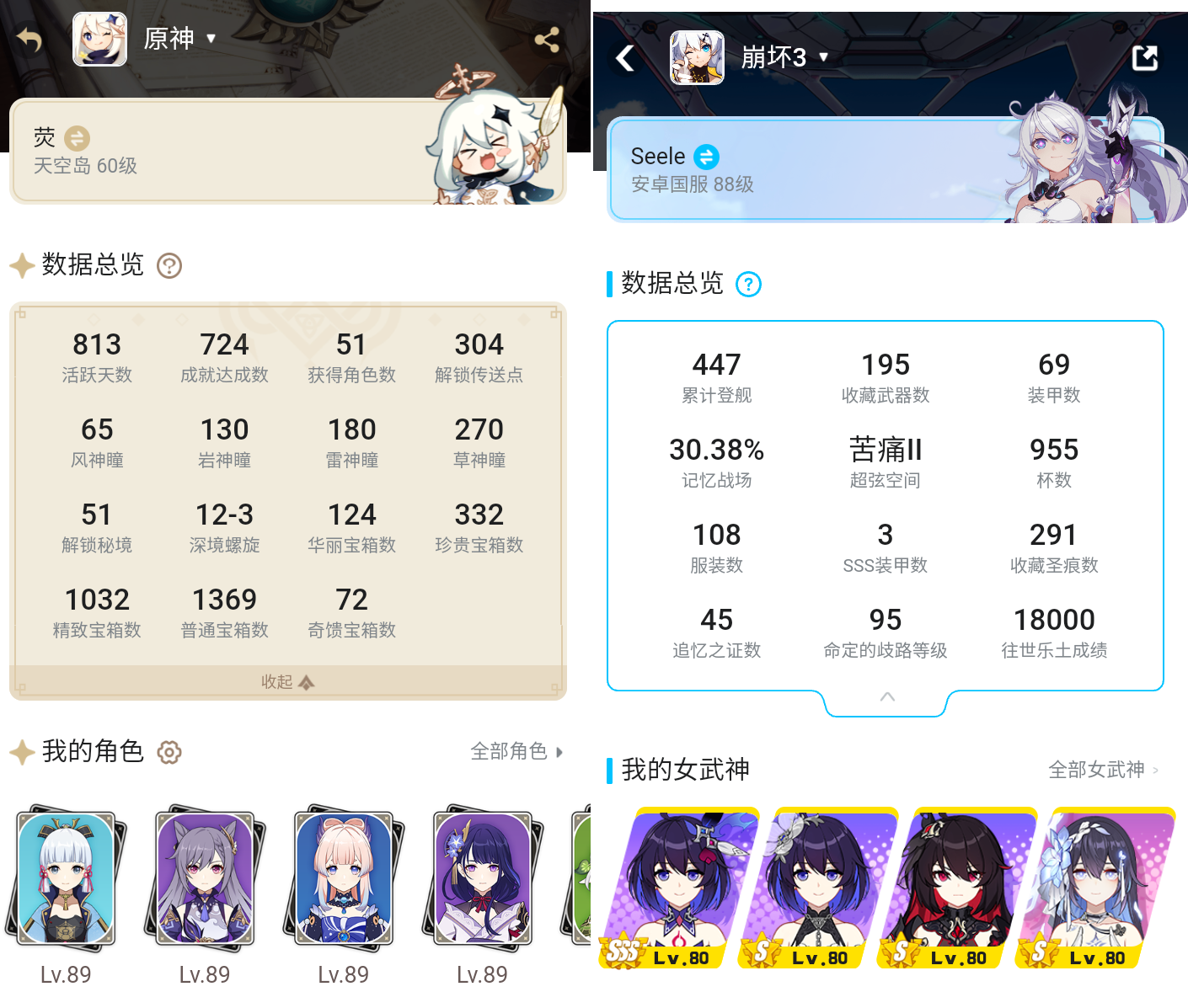 也不是没玩过其它游戏,只是不想有太多事要干,删删减减就剩下这两个我还愿意玩的了,其实崩3是原神后不久入坑的,但因为退过几次又回过几次,所以天数匹配不上,但最近因为希儿又回来了,顺便搞了个原画集,上次原画集正好是退坑后不久,搞得我现在缺第一册难受死了,都犹豫要不要去把它买回来。至于原没啥好说的,只是一个风景取材的东西,除了第一个五星-刻晴和第一个限定五星-绫华,有点历史情怀以外,其它角色是真的不熟。除非活动和新版本,这两游戏用的时间真不多,原就上线做个委托,蹦就上线几个一键做满活跃,平均下来不到半个小时。