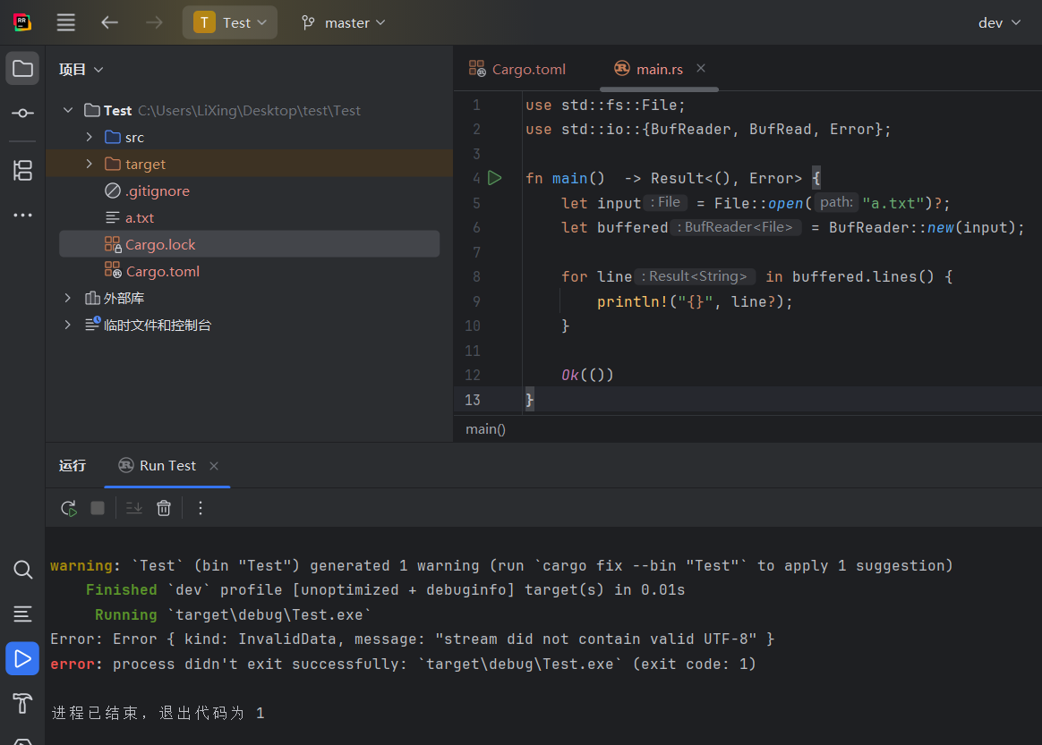 当a.txt采用UTF-8编码时,一切正常;(虽然你可能觉得上面的写法很奇怪,但换成正常的file.read_to_string也是一样的结果)而当a.txt采用GBK编码时,自然就产生了编码错误